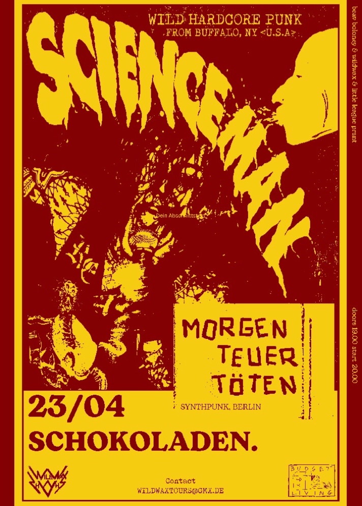 Tickets für SCIENCE MAN (deranged hc-punk, us) & MORGEN TEUER TÖTEN (synth-punk, bln) 23.04.26 in Berlin, Schokoladen