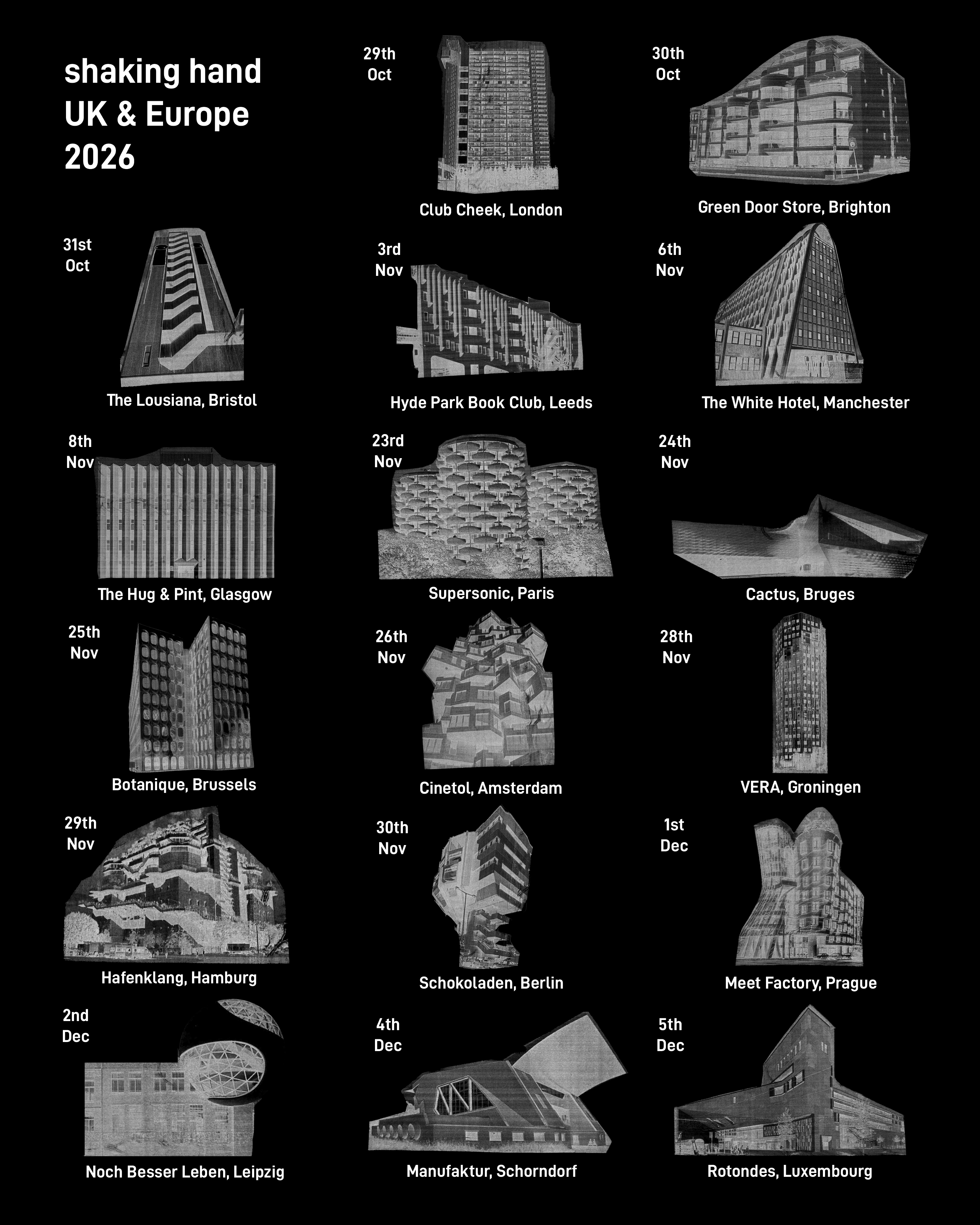 SHAKING HAND are a Manchester trio who construct long slowburning post-rock in multiple tunings and time signatures, taking inspiration from modernist architecture, 90s US alternative and midwestern emo. The band’s musical DNA runs through experimental guitar outfits like Women, Slint, Sonic Youth, Pavement, and Ulrika Spacek, balanced with the melodic sensibility of Big Thief and the dynamic intimacy of Yo La Tengo.